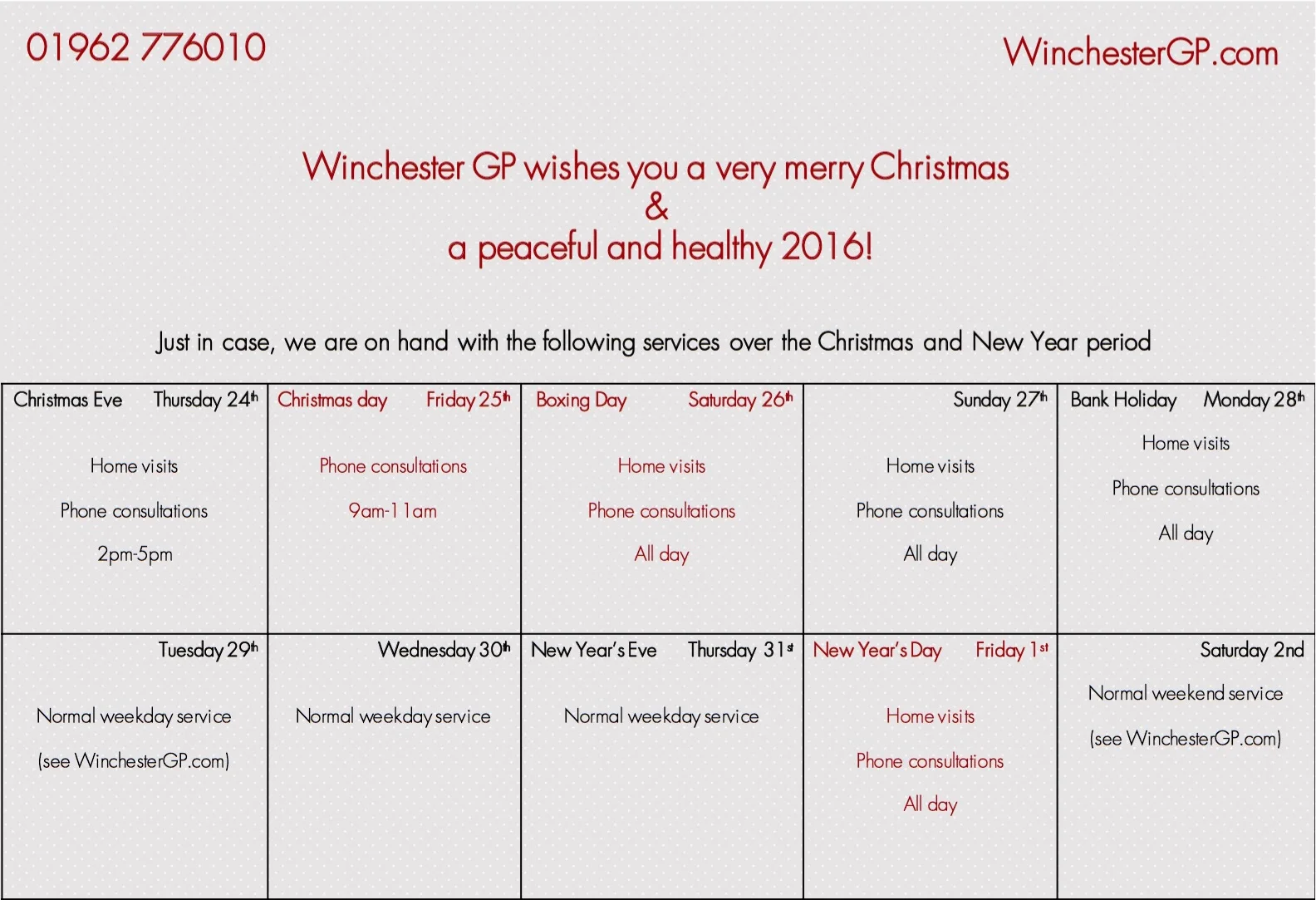 We wish all of our patients, their families and friends, a fabulous Christmas break and a healthy and happy 2016. We hope you don't have reason to call us, but just in case you do, we have the following services available, over the festive season.