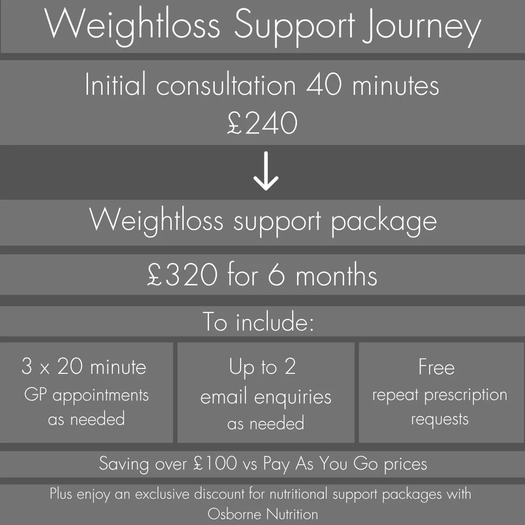 The decision to start weight loss medications takes careful consideration. At Winchester GP we start the process with an unhurried 40 minute consultation with one of our GPs, cost £240. This gives plenty of time for a non-judgemental exploration of your history, and to answer any questions you may have.